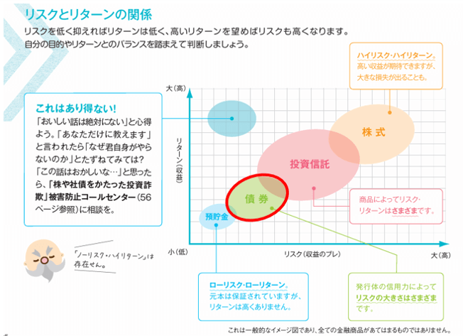 日本証券業協会の資料によると債券投資は、株式投資よりリスクもリターンも抑えられる傾向にあります。