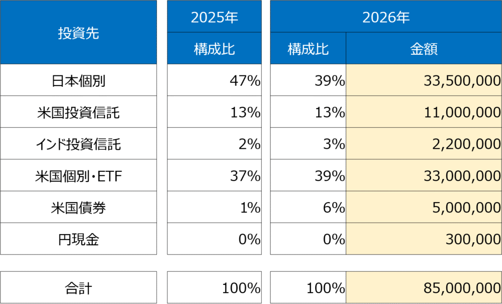 2026年の目標は、8,500万円を達成させることなので、下記表の金額を目指してリバランスを行っていきます。