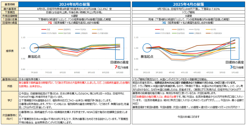 私は過去、2024年8月と2025年4月に暴落を経験しましたが、!!暴落時は、絶好の買い場!!として活用をすることが出来ませんでした。だからこの反省を活かし、次回の暴落時には適切な対応が出来るように準備をすることで、運用成績を改善させることが出来ると思っています。